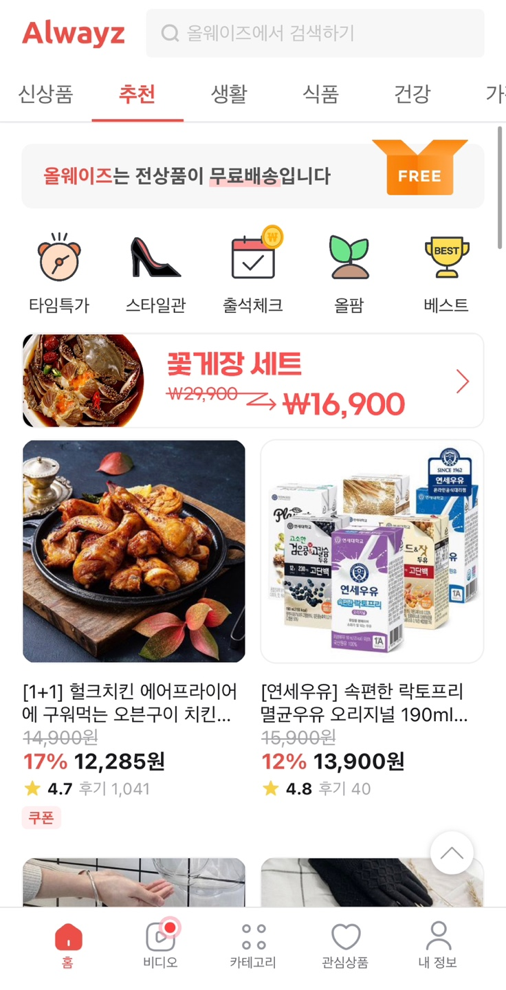 올웨이즈 어플은 간단하게 말하자면, 쿠팡이나 위메프와 같은 어플인데요. 사진을 보시면 타임특가, 스타일관 등 여러가지 탭이 있고 그 밑에는 물품을 파는 링크들이 있는 걸 보실 수 있어요. 이 중에서 저희가 주로 사용할 부분은 바로 새싹모양이 있는 올팜 탭입니다.