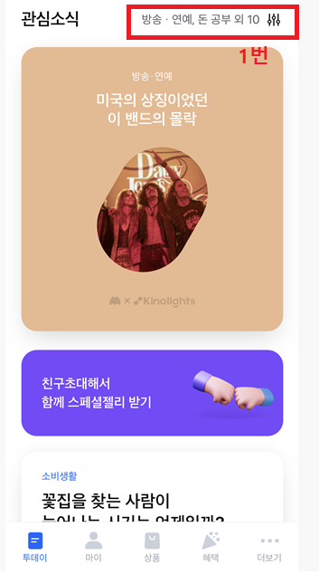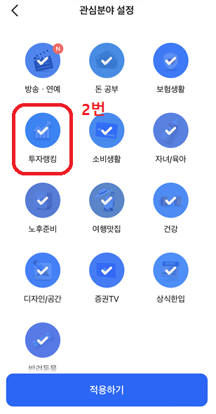 혹시라도 관심사에 투자랭킹이 설정되어 있지 않다면 클릭할 수가 없으니 제일 위에 관심소식 옆에 볼륨과 흡사한 아이콘 보이나요? 이걸 클릭해서(1번) 투자랭킹에 체크표시가 되도록 눌러주시고 적용하기 버튼을 이용해 설정(2번)해주시면 된답니다~!