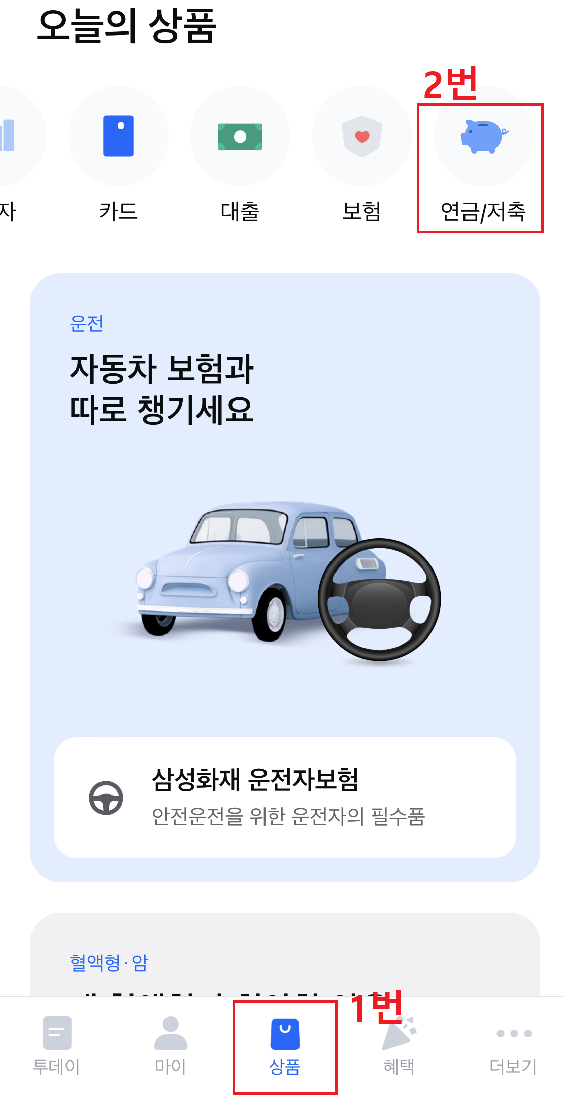 제일 아래 가운데 있는 상품버튼 있죠? 여기를 클릭하신 다음, 위에 보험 탭을 클릭해주실까요? 그러면 이제 보험상품들이 나오는데 여기서 삼성화재 다이렉트 건강보험을 클릭하면 끝난답니다~! 참 쉽죠잉?