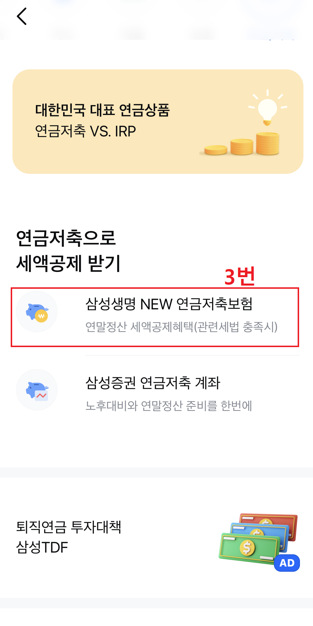 자! 그럼 미션 수행방법 알아볼까요? 상품 탭으로 들어가서 이제는 연금/저축을 클릭해주세요. 그리고 삼성생명 NEW 연금저축보험 클릭하시면 끝이랍니다~! 이제 마지막 하나 남았어요! 성공해보자고요~!