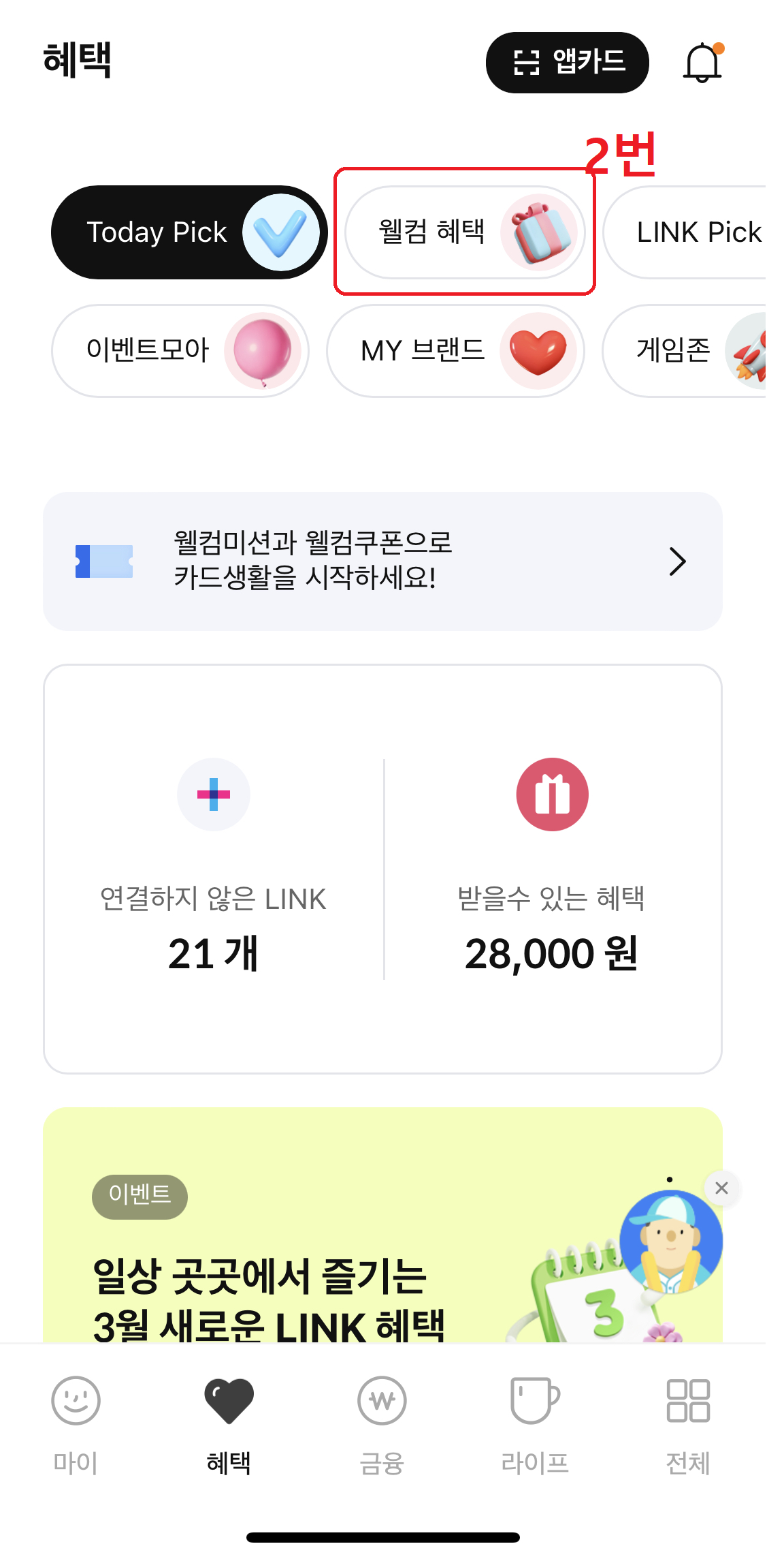 뭔가 가시적인 혜택이 있는 부분을 여러분들에게 먼저 소개해드렸는데 어떤가요? 저는 여기서 추가로 하나 더 알려드리고 싶은게 있어요. LINK 연결이라고 해서 클릭을 통해 여러분들이 카드를 결제했을때 바로 할인을 받을 수 있는건데요.