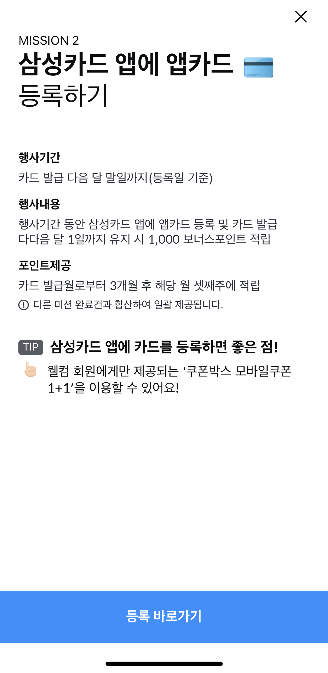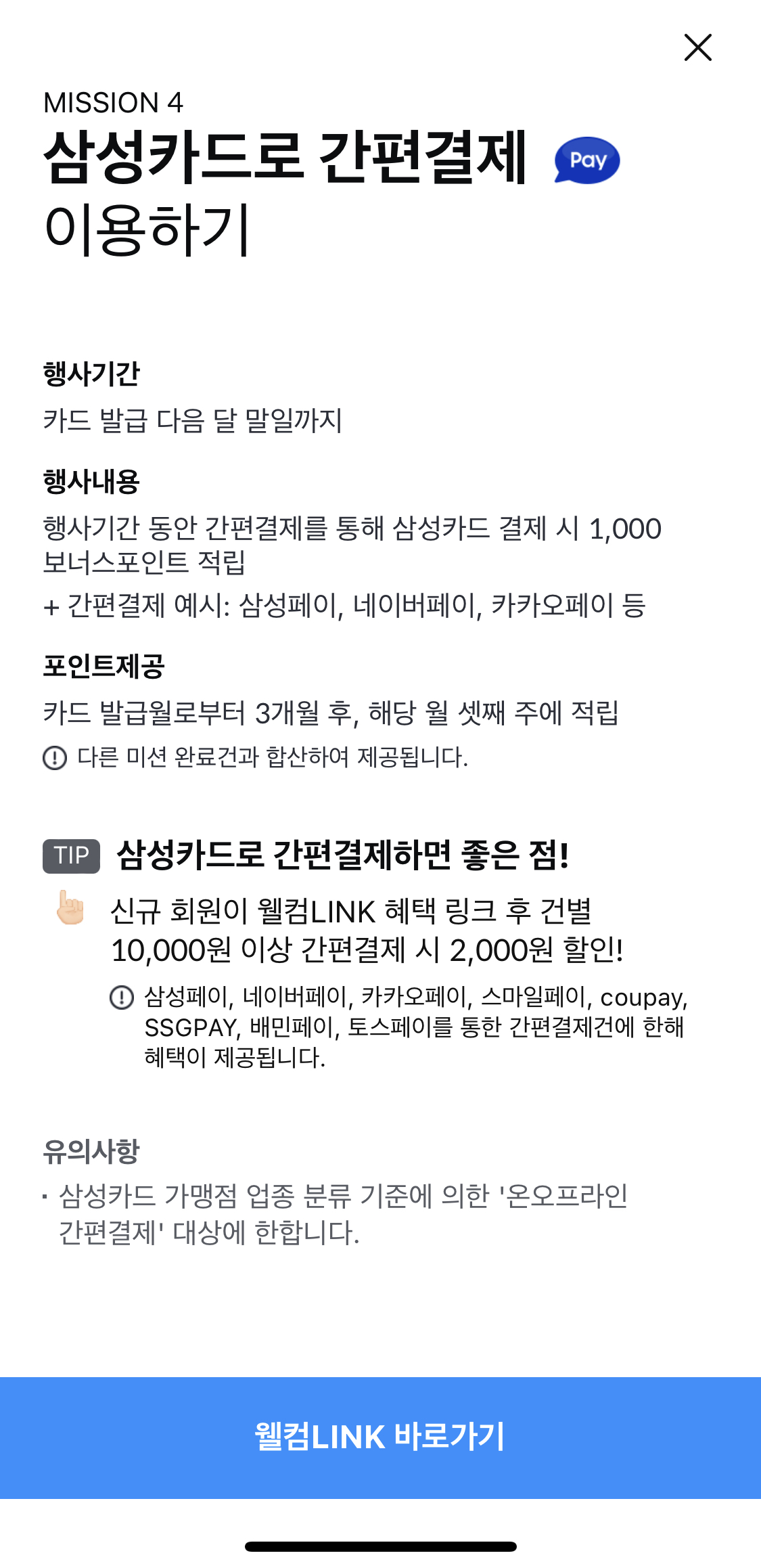 이 미션을 수행하면 1,000포인트가 리워드로 지급됩니다. 요즘은 거의 다 간편결제라 그렇게 수행하기 어려운 미션은 아니네요. 이제 마지막으로 가볼까요?