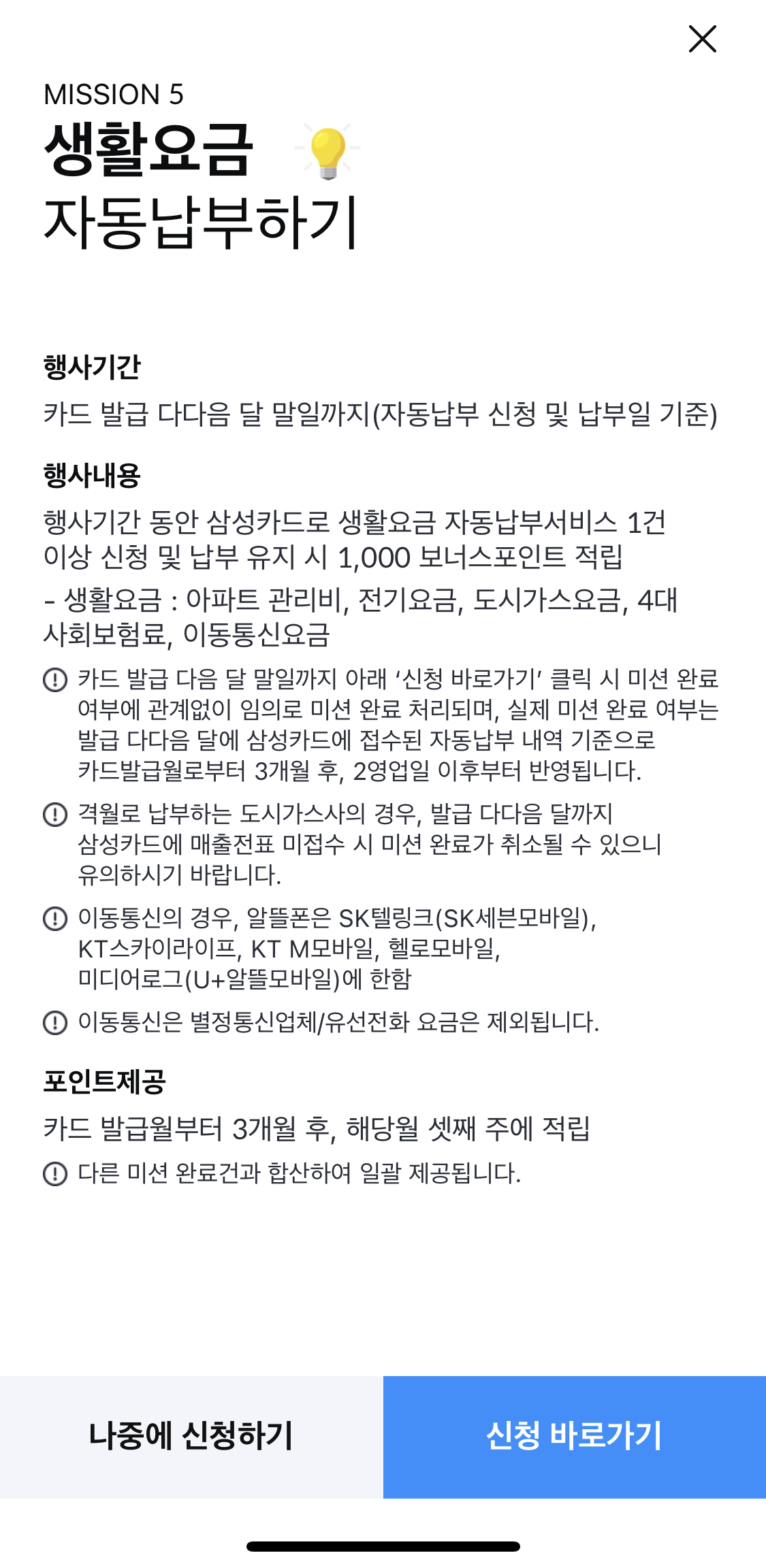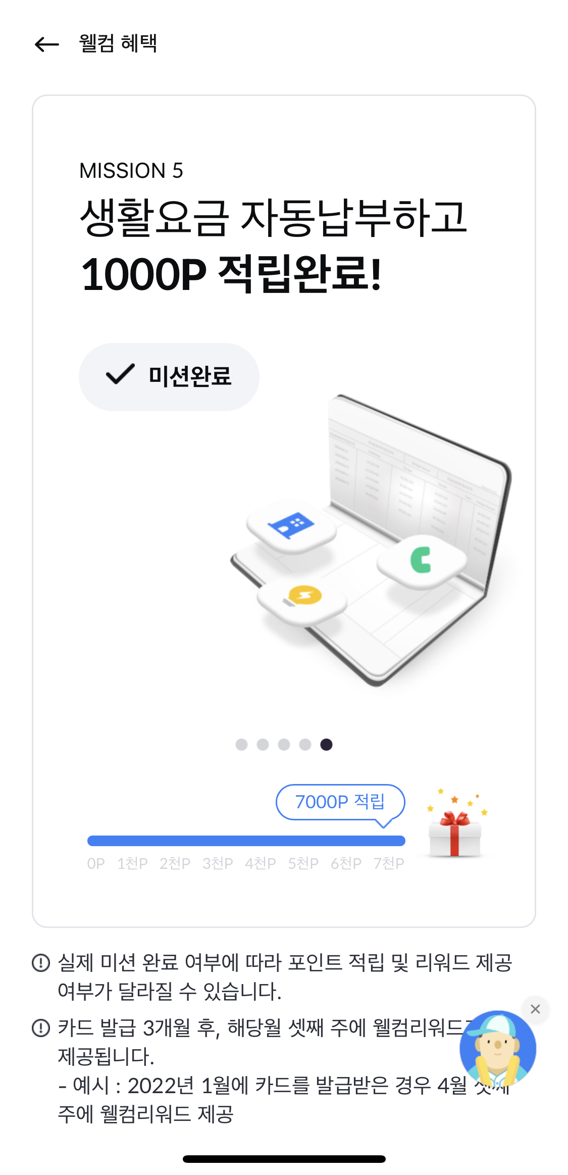 이 미션은 카드 발급 후 다음 달 말일까지 수행 가능하고 리워드는 카드 발급 3개월 후, 셋째주에 리워드를 받을 수 있습니다. 이 미션을 수행하면 1,000포인트를 획득할 수 있으세요.