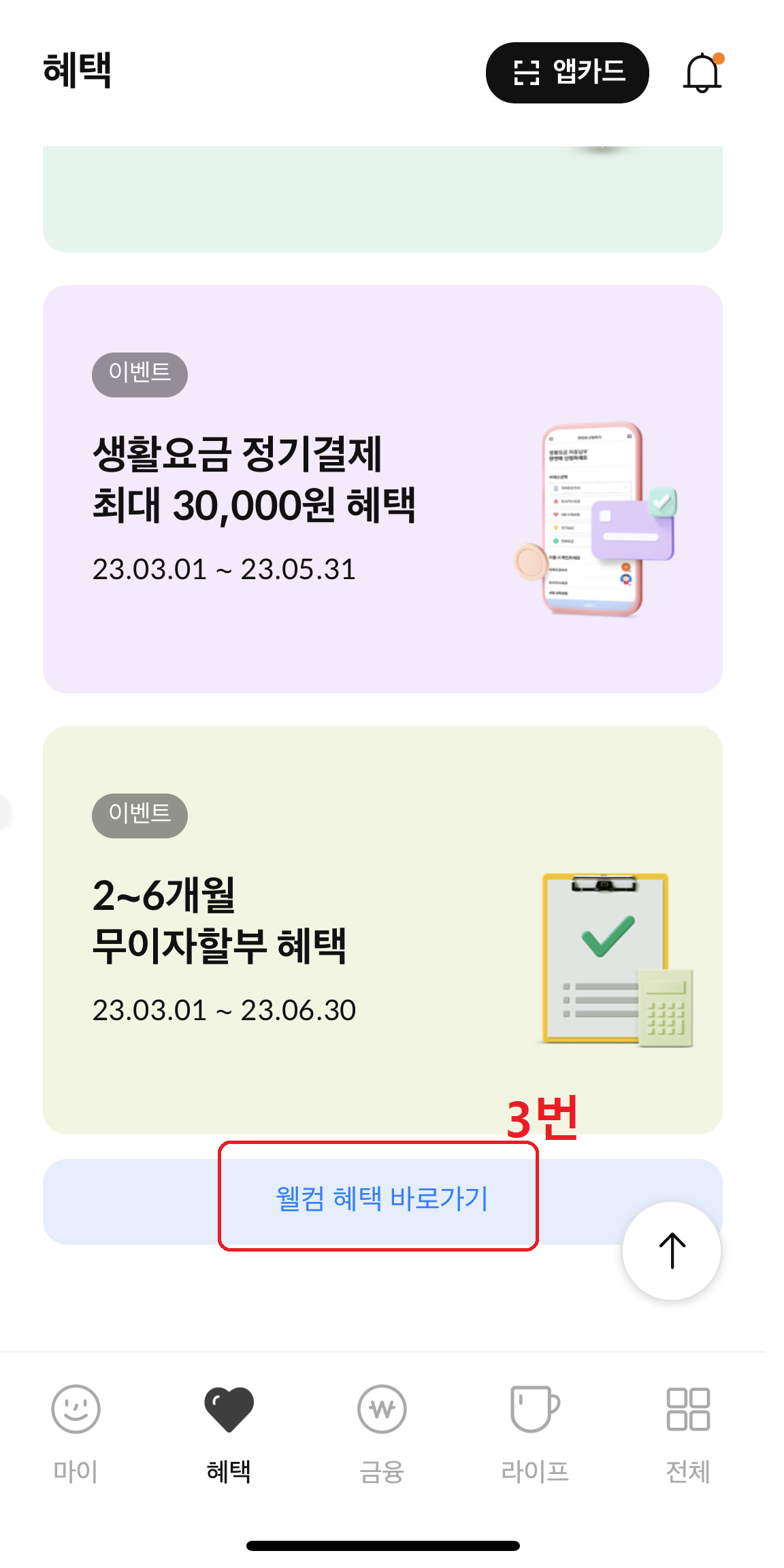 이번에 한 미션은 웰컴미션으로 전혀 어렵지가 않답니다. 저는 이미 모든 미션을 수행해서 지금 어플 자체에서는 뜨진 않지만 혜택탭으로 들어가시면 웰컴 혜택을 클릭한 후, 웰컴 혜택 바로가기를 클릭하면 어떤 미션이 있는지 볼 수 있더라고요. 혹시 이번에 삼성카드를 발급받으시고 처음으로 삼성카드 어플을 설치하셨다면 한번 도전해보세요.