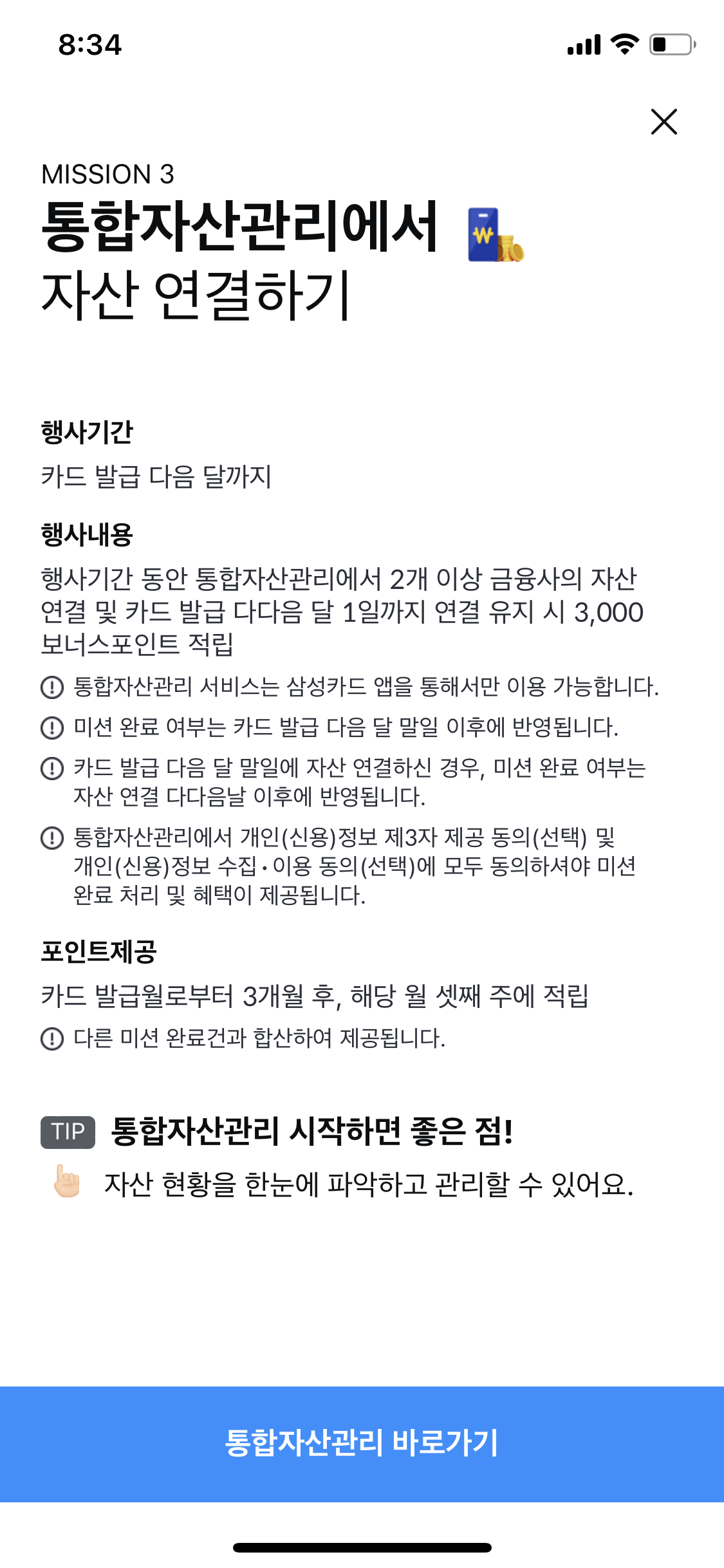 삼성카드도 똑같네요. 삼성카드 통합자산에 연결하시면 3,000포인트 리워드가 지급됩니다. 지급일은 위에 써놓았으니 참고바랍니다. 이제 5,000 포인트 달성!