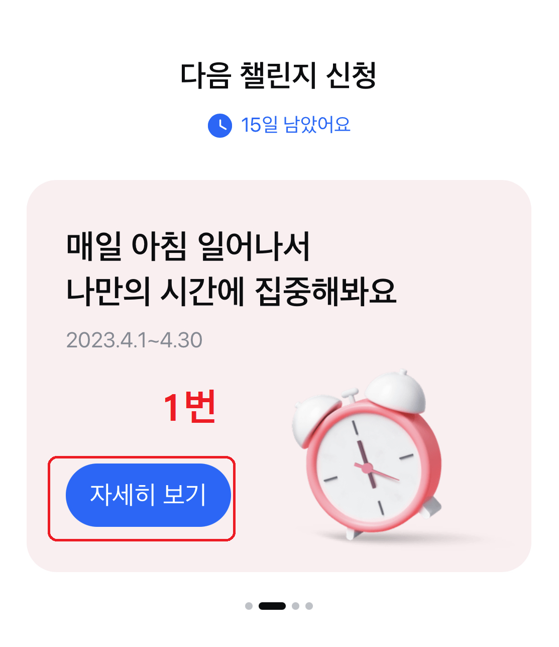 자! 이제 우리 그럼 4월 챌린지를 모두 신청완료하셨답니다. 혹시라도 알림이 필요하신 분들이 있으시면 각종 챌린지 화면 상단 우측을 보시면 됩니다. 알림 버튼만 활성화해주시면 매일 그 시간마다 알림이 뜬답니다. 그럼 그 시간에 들어가서 확인해주시고 챌린지 인증해주면 끝!