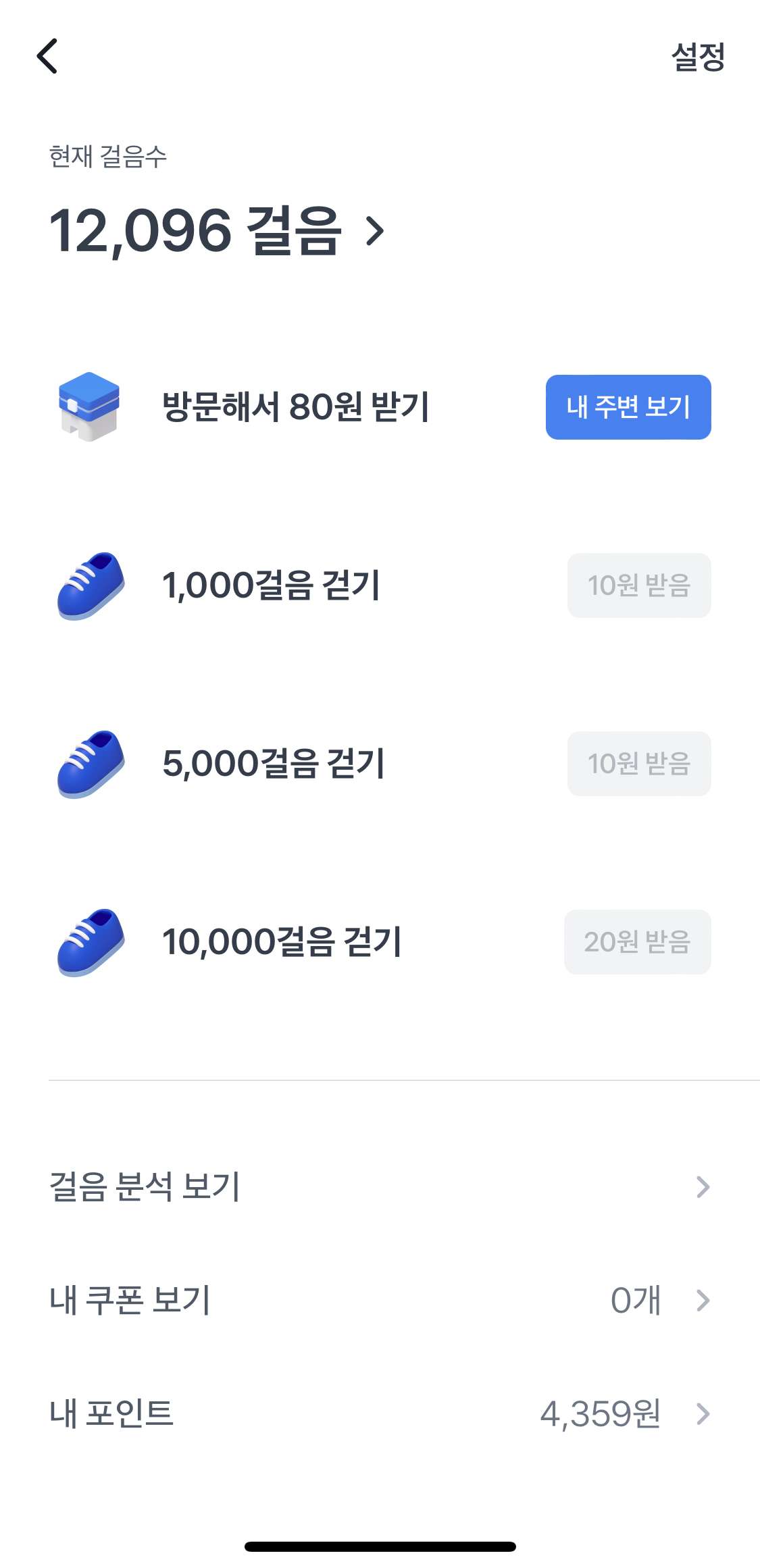 그리고 1,000보/5,000보/10,000보 기준으로 해서 이 수치를 넘기면 10원/10원/20원씩 주고 있어서 하루에 장소 방문하기와 걷기를 모두 완료해주시면 총 140원을 벌 수 있어요! 이렇게 30일을 하시면 140x30이니까 헉! 한달동안 4,200원을 벌 수 있네요! 이렇게 금액을 보니 주중에도 분발하도록 해야겠어요!