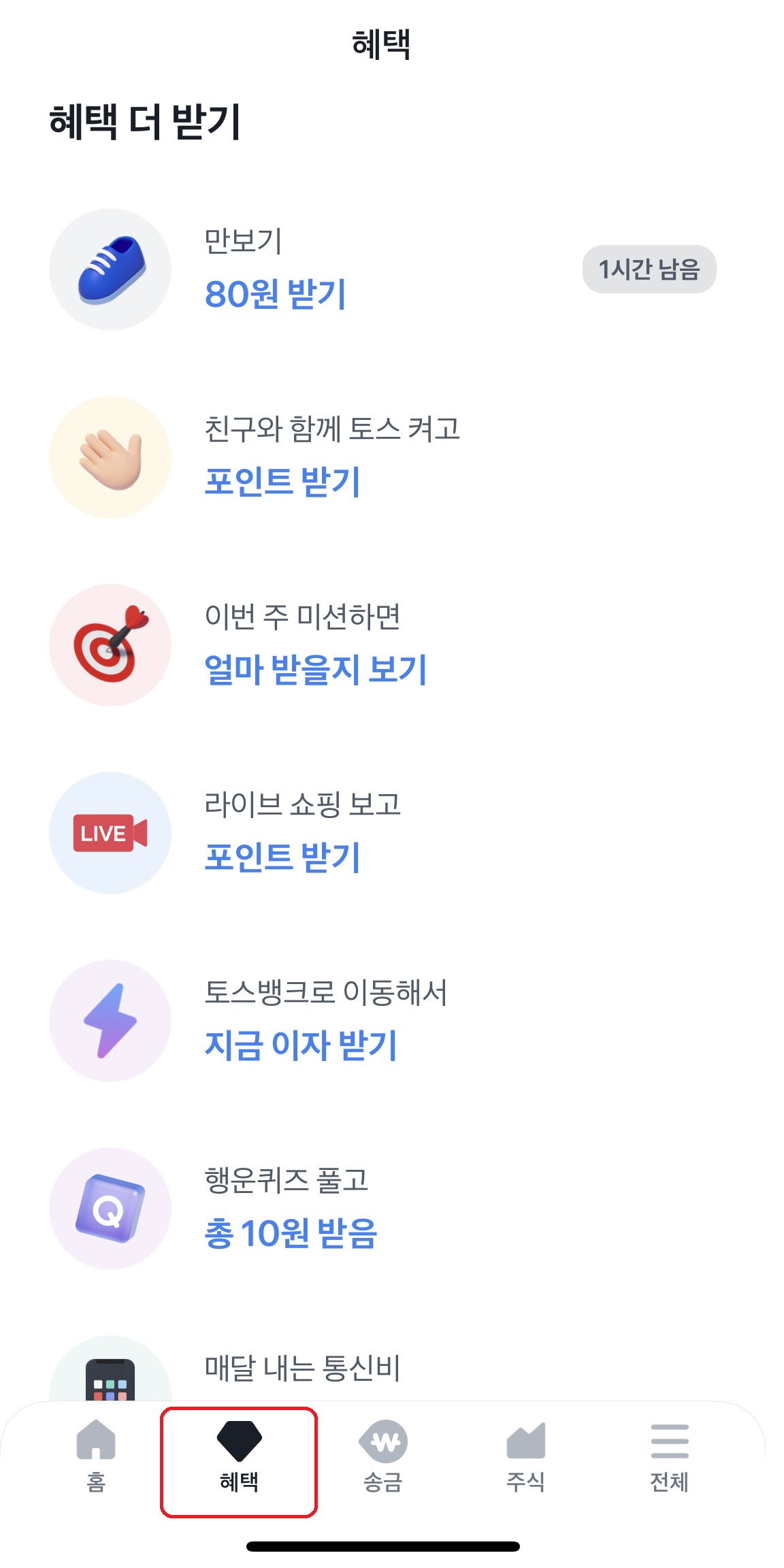 그럼 토스어플로 앱테크를 하는 방법에 대해 소개해드릴게요! 위의 사진들이 보이시나요? 사진을 보시면 제일 아래에 혜택탭이라고 빨간색으로 상자표시를 한 부분이 있답니다. 여기를 클릭하시면 저희가 딱! 앱테크를 할 수 있는 모든 종목들이 다 나와있어요.