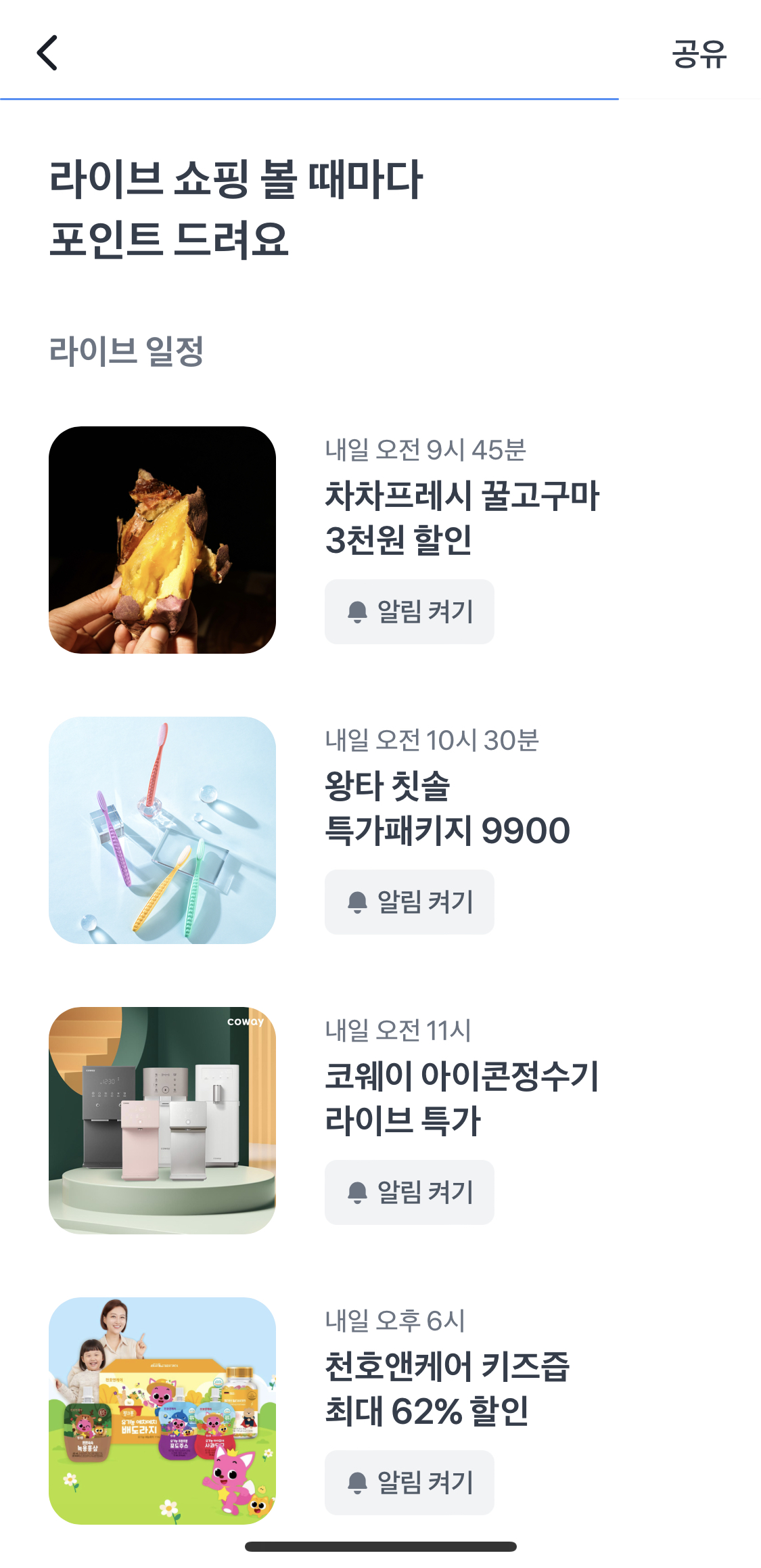 이것도 정말 어렵지 않아요! 아침마다 라이브 쇼핑하기 탭으로 들어가서 알림을 켜두신 다음, 해당 라이브 쇼핑이 진행될때 들어가서 클릭만 하면 방송당 3원씩 획득하실 수 있답니다. 아침마다 알림 설정해두시고 꼭 들어가도록 해요!