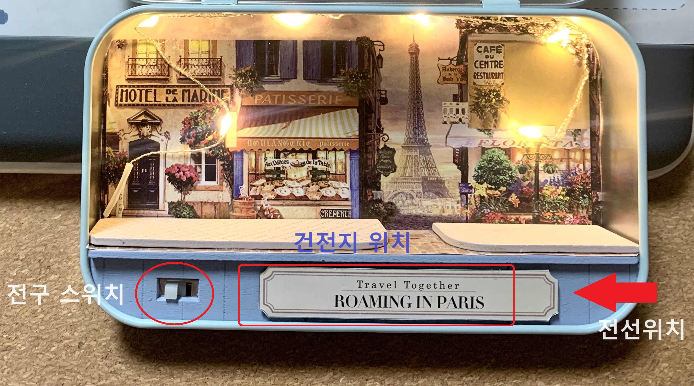 선이 보이면 너무 예쁘지 않으니까 이번 패키지는 선이랑 건전지를 넣는 부분을 아래쪽에 공간(화살표)을 만들어서 안보이게 제작할 수 있도록 나왔더라고요. 전구가 켜지니 제법 멋있지 않나요?
